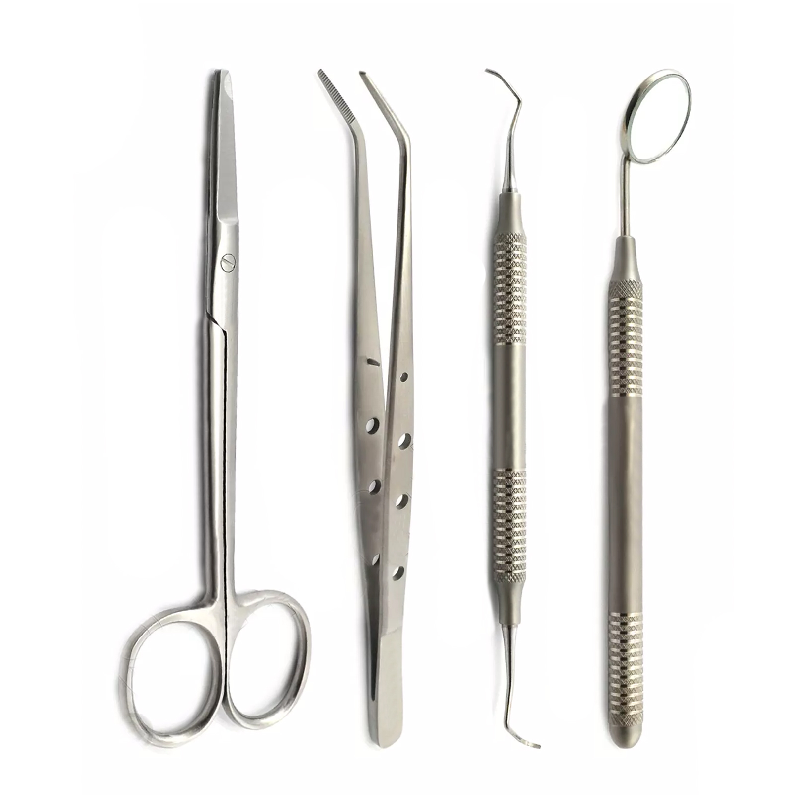 Il kit per la rimozione delle suture dentali include quattro strumenti essenziali: specchio con impugnatura, pinzetta London College, Columbia Curette 13/14 e…